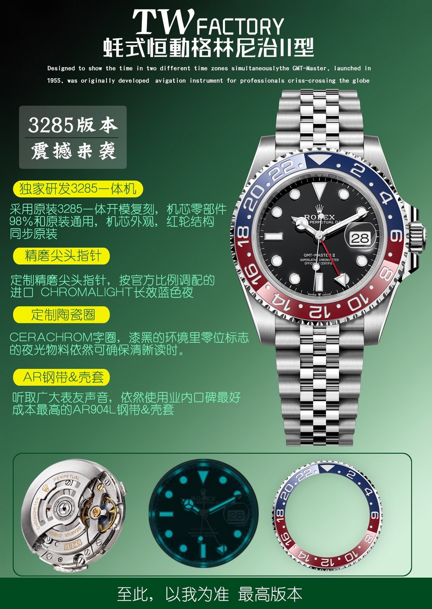 【品牌】欧米茄【产品介绍】TW厂最新顶级版本格林尼治 m126710blro-0001采用专柜机芯3285一体机芯蓝游丝和原版同样通过调试时针快跳调整日历的功能瞬跳,和原版一样的GMT双时区表针在底部时针上面的第二层,由下到上的顺序为:时针-双时区针-分钟-秒钟。本次可乐/国米圈可以说是99%以上的相似度/在各个角度均有这个99%水准。后续有详细颜色对比。本次圈口为独立开发,区别于市面上的任何版本。表盘/指针/玻璃/表壳就不再一一赘述,原装一比一开模制作,保持大厂工艺水准。TW厂一直秉承着,无原装,不开发,不达标,不出货的原则,从来不会在某个款式上,急功近利的争抢第一名出货的工厂,希望能够在表友玩表的路途上,能够做到亦师亦友,有则改之,无则加勉。【款式】男款【尺寸】直径40mm【表带】904L精钢表带【镜面】蓝宝石镜面【机芯】3285一体机芯【防水】100米【配件】原装盒,说明书,质保卡,吊牌,香港机打发票【品质检测】保证所有手表实物拍摄,所见即所得 , 手表发货前都会有严格检查测试,确保您收到的手表无质量问题