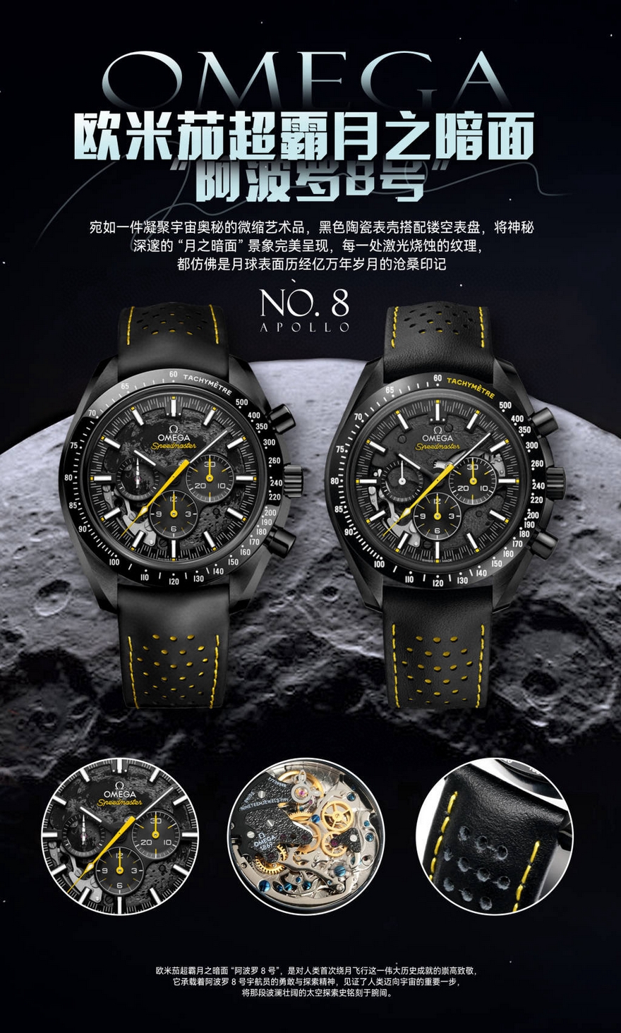 【品牌】欧米茄【产品介绍】OMEGA-欧米茄 第二代阿波罗八号!9位秒针!(第二代9位置小火箭秒针)1969 年限量版腕表,纪念人类成功登月!采用7750改3861原装机芯…44.25mm直径!1968年阿波罗8号成功实现环月旅行,执行该任务的宇航员也因此首次看到了月球背面的景象[赞R]。为了纪念此次任务成功执行50周年,欧米茄推出阿波罗8号月之暗面超霸系列【款式】男款【尺寸】直径44.25mm【表带】牛皮表带【镜面】蓝宝石镜面【机芯】3861手动计时机芯【防水】50米【配件】原装盒,说明书,质保卡,吊牌,香港机打发票【品质检测】保证所有手表实物拍摄,所见即所得 , 手表发货前都会有严格检查测试,确保您收到的手表无质量问题