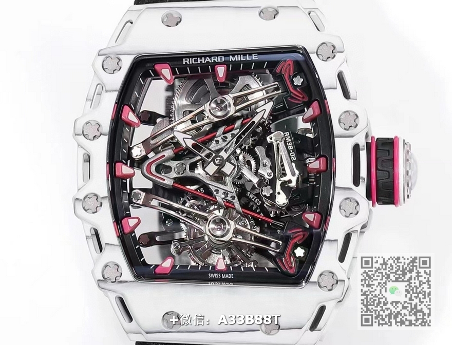 【品牌】理查德米勒【产品介绍】新表RICHARD MILLE 理查米尔 推出 RM 38-02 Tourbillon Bubba Watson 粉色主题镂空陀飞轮腕表:高尔夫球灵感风格醒目的新作——「RM 38-02 Tourbillon Bubba Watson」陀飞轮腕表与高尔夫职业球手 Bubba Watson 合作设计,独特的粉红色来自这位高尔夫名将钟爱的 PING 一号球杆,风格尤为明快,让人心生愉悦。新作表圈和底盖采用粉色和白色石英碳纤维复合材料加工而成,中层表壳则以碳纤维和粉色石英碳纤维制成,每一个表壳都有独一无二的交错纹理。梯桶形表壳能够更舒适紧密的贴合手腕,表冠顶部巧妙模仿高尔夫球的凹凸造型,是颇为有趣的细节。全开放式表盘让佩戴者清晰欣赏机芯的完整运转,镂空桥板在表盘中勾勒出横向的「V」字形,粉色手绘图案则来自 Bubba Watson 使用的球杆杆头。6点陀飞轮结构能够承受10000g冲击力,职业球手在高速击杆时也能稳定运转。搭载 RM 38-02 手动上链机芯,摆频28800vph,提供52小时动力储备。这枚机芯采用碳纤维制作镂空底板,具备优异的防震性能。桥板依然为坚固的 5级钛金属材质,背面的小孔亦融入粉色元素装饰。【款式】男款【尺寸】43.70 x 50.04mm【表带】橡胶表带/尼龙纤维表带,两种表带类型可供选择,二选一【镜面】蓝宝石镜面【机芯】RM38-02手动陀飞轮机芯【防水】50米防水【配件】原装盒,说明书,质保卡,吊牌,香港机打发票【品质检测】保证所有手表实物拍摄,所见即所得 , 手表发货前都会有严格检查测试,确保您收到的手表无质量问题