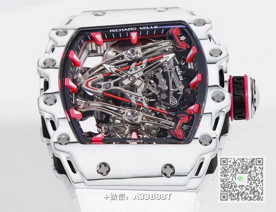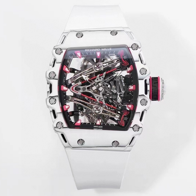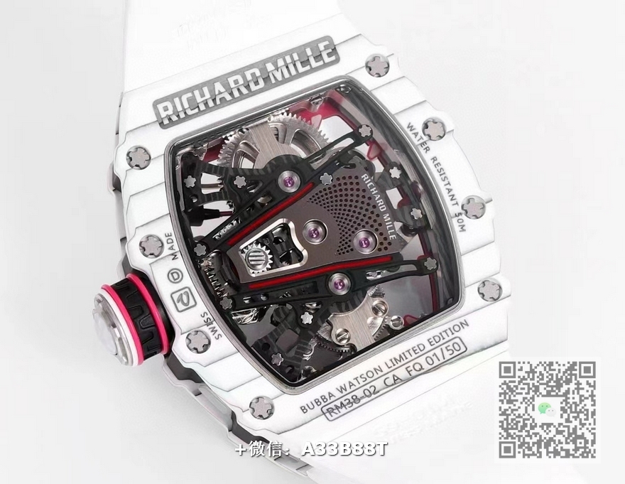 【品牌】理查德米勒【产品介绍】新表RICHARD MILLE 理查米尔 推出 RM 38-02 Tourbillon Bubba Watson 粉色主题镂空陀飞轮腕表:高尔夫球灵感风格醒目的新作——「RM 38-02 Tourbillon Bubba Watson」陀飞轮腕表与高尔夫职业球手 Bubba Watson 合作设计,独特的粉红色来自这位高尔夫名将钟爱的 PING 一号球杆,风格尤为明快,让人心生愉悦。新作表圈和底盖采用粉色和白色石英碳纤维复合材料加工而成,中层表壳则以碳纤维和粉色石英碳纤维制成,每一个表壳都有独一无二的交错纹理。梯桶形表壳能够更舒适紧密的贴合手腕,表冠顶部巧妙模仿高尔夫球的凹凸造型,是颇为有趣的细节。全开放式表盘让佩戴者清晰欣赏机芯的完整运转,镂空桥板在表盘中勾勒出横向的「V」字形,粉色手绘图案则来自 Bubba Watson 使用的球杆杆头。6点陀飞轮结构能够承受10000g冲击力,职业球手在高速击杆时也能稳定运转。搭载 RM 38-02 手动上链机芯,摆频28800vph,提供52小时动力储备。这枚机芯采用碳纤维制作镂空底板,具备优异的防震性能。桥板依然为坚固的 5级钛金属材质,背面的小孔亦融入粉色元素装饰。【款式】男款【尺寸】43.70 x 50.04mm【表带】橡胶表带/尼龙纤维表带,两种表带类型可供选择,二选一【镜面】蓝宝石镜面【机芯】RM38-02手动陀飞轮机芯【防水】50米防水【配件】原装盒,说明书,质保卡,吊牌,香港机打发票【品质检测】保证所有手表实物拍摄,所见即所得 , 手表发货前都会有严格检查测试,确保您收到的手表无质量问题