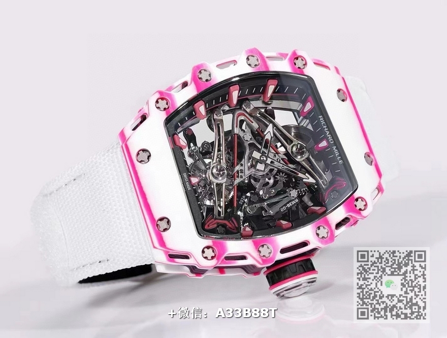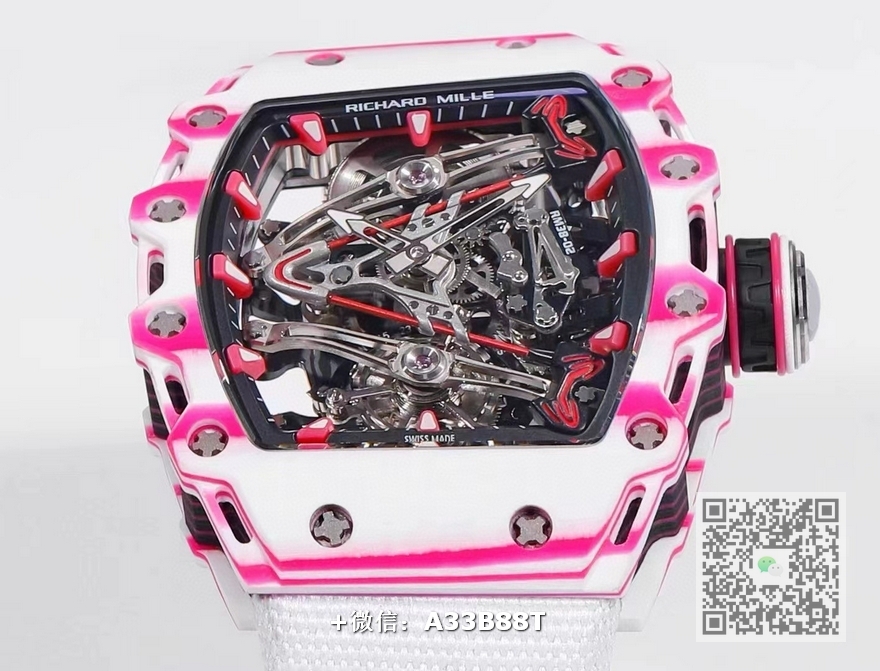 【品牌】理查德米勒【产品介绍】新表RICHARD MILLE 理查米尔 推出 RM 38-02 Tourbillon Bubba Watson 粉色主题镂空陀飞轮腕表:高尔夫球灵感风格醒目的新作——「RM 38-02 Tourbillon Bubba Watson」陀飞轮腕表与高尔夫职业球手 Bubba Watson 合作设计,独特的粉红色来自这位高尔夫名将钟爱的 PING 一号球杆,风格尤为明快,让人心生愉悦。新作表圈和底盖采用粉色和白色石英碳纤维复合材料加工而成,中层表壳则以碳纤维和粉色石英碳纤维制成,每一个表壳都有独一无二的交错纹理。梯桶形表壳能够更舒适紧密的贴合手腕,表冠顶部巧妙模仿高尔夫球的凹凸造型,是颇为有趣的细节。全开放式表盘让佩戴者清晰欣赏机芯的完整运转,镂空桥板在表盘中勾勒出横向的「V」字形,粉色手绘图案则来自 Bubba Watson 使用的球杆杆头。6点陀飞轮结构能够承受10000g冲击力,职业球手在高速击杆时也能稳定运转。搭载 RM 38-02 手动上链机芯,摆频28800vph,提供52小时动力储备。这枚机芯采用碳纤维制作镂空底板,具备优异的防震性能。桥板依然为坚固的 5级钛金属材质,背面的小孔亦融入粉色元素装饰。【款式】男款【尺寸】43.70 x 50.04mm【表带】橡胶表带/尼龙纤维表带,两种表带类型可供选择,二选一【镜面】蓝宝石镜面【机芯】RM38-02手动陀飞轮机芯【防水】50米防水【配件】原装盒,说明书,质保卡,吊牌,香港机打发票【品质检测】保证所有手表实物拍摄,所见即所得 , 手表发货前都会有严格检查测试,确保您收到的手表无质量问题