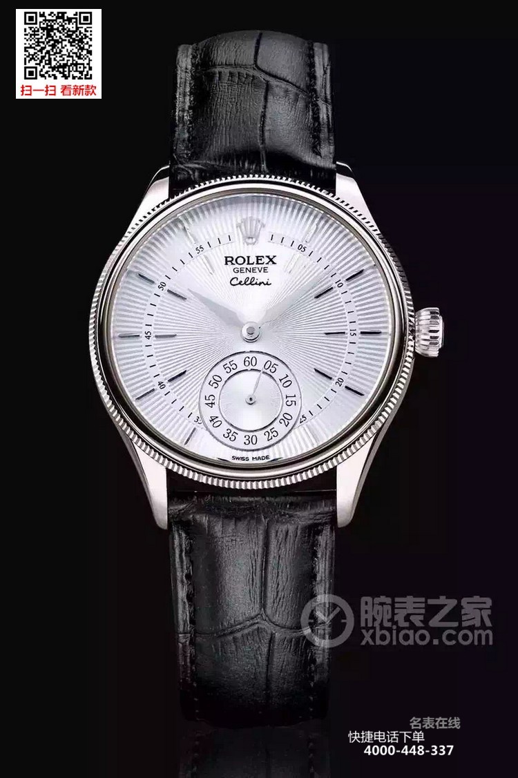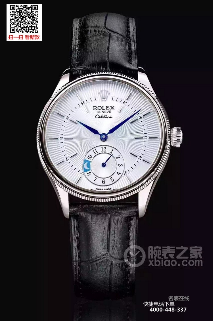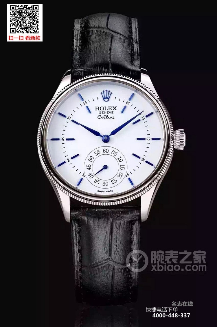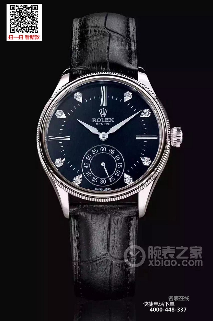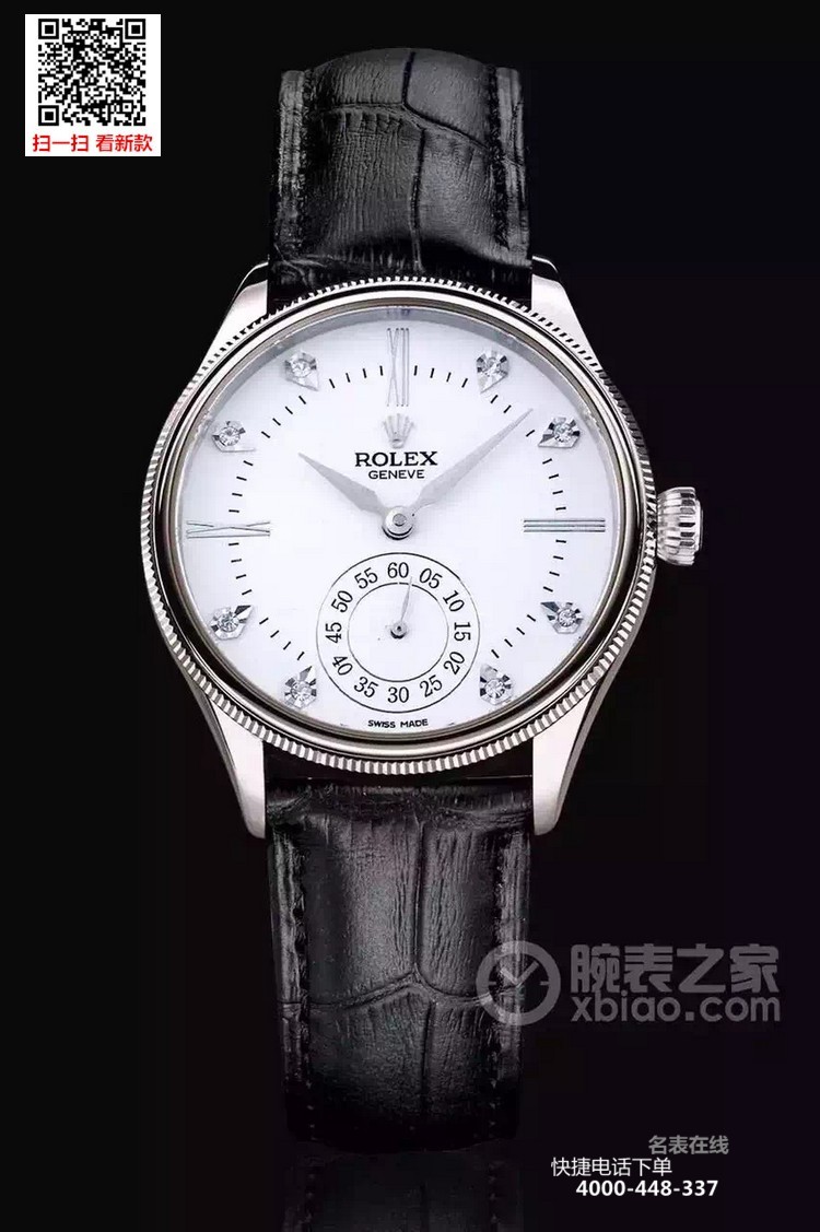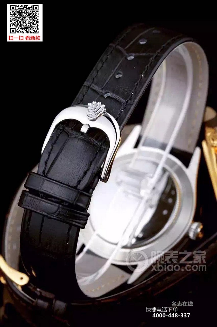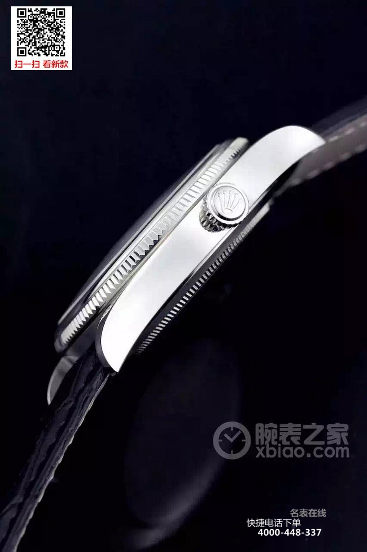 {品牌}:劳力士{款式}:中性款{尺寸}:直径约39mm 厚度约10mm{表带}:真皮表带{镜面}:蓝宝石抗划镜面{机芯}:瑞士ETA全自动机械机芯{防水}:50米{配件}:原装盒,说明书,质保卡,吊牌,香港机打发票