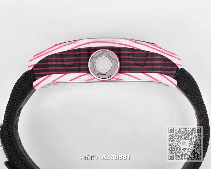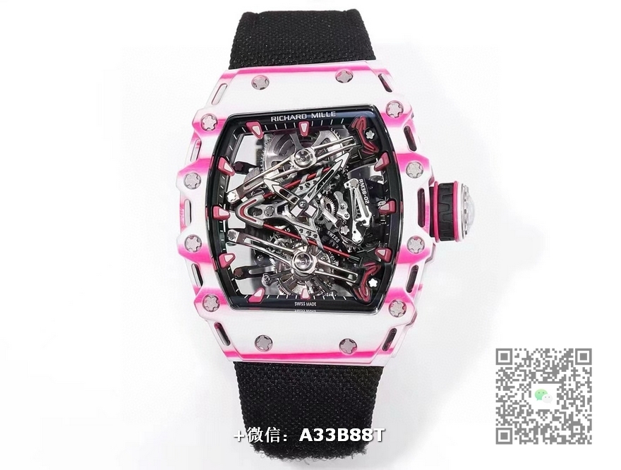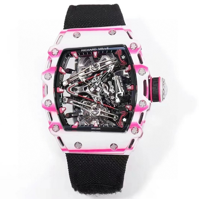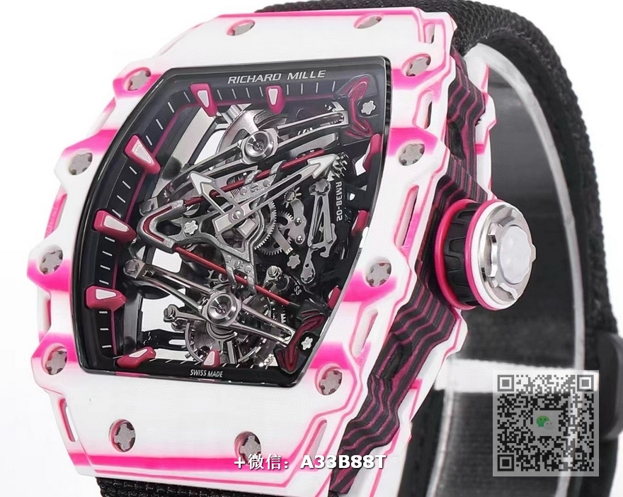 【品牌】理查德米勒【产品介绍】新表RICHARD MILLE 理查米尔 推出 RM 38-02 Tourbillon Bubba Watson 粉色主题镂空陀飞轮腕表:高尔夫球灵感风格醒目的新作——「RM 38-02 Tourbillon Bubba Watson」陀飞轮腕表与高尔夫职业球手 Bubba Watson 合作设计,独特的粉红色来自这位高尔夫名将钟爱的 PING 一号球杆,风格尤为明快,让人心生愉悦。新作表圈和底盖采用粉色和白色石英碳纤维复合材料加工而成,中层表壳则以碳纤维和粉色石英碳纤维制成,每一个表壳都有独一无二的交错纹理。梯桶形表壳能够更舒适紧密的贴合手腕,表冠顶部巧妙模仿高尔夫球的凹凸造型,是颇为有趣的细节。全开放式表盘让佩戴者清晰欣赏机芯的完整运转,镂空桥板在表盘中勾勒出横向的「V」字形,粉色手绘图案则来自 Bubba Watson 使用的球杆杆头。6点陀飞轮结构能够承受10000g冲击力,职业球手在高速击杆时也能稳定运转。搭载 RM 38-02 手动上链机芯,摆频28800vph,提供52小时动力储备。这枚机芯采用碳纤维制作镂空底板,具备优异的防震性能。桥板依然为坚固的 5级钛金属材质,背面的小孔亦融入粉色元素装饰。【款式】男款【尺寸】43.70 x 50.04mm【表带】橡胶表带/尼龙纤维表带,两种表带类型可供选择,二选一【镜面】蓝宝石镜面【机芯】RM38-02手动陀飞轮机芯【防水】50米防水【配件】原装盒,说明书,质保卡,吊牌,香港机打发票【品质检测】保证所有手表实物拍摄,所见即所得 , 手表发货前都会有严格检查测试,确保您收到的手表无质量问题